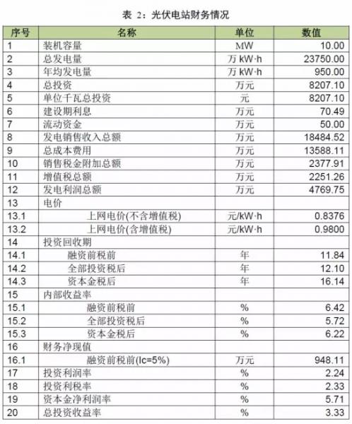 江蘇對應(yīng)的光伏標桿電價為0.98元/kWh,假設(shè)項目裝機容量為10MW,單位造價8000元,依據(jù)以上條件測算,年滿發(fā)小時數(shù)在950h左右,依據(jù)以上條件測算,項目融資前稅前收益率在6.42%之間,投資回收期在11年之間,項目不具備投資條件,具體見下表。到單位造價降到7100元左右時,項目融資前稅前收益率可達到8%,滿足投資要求。