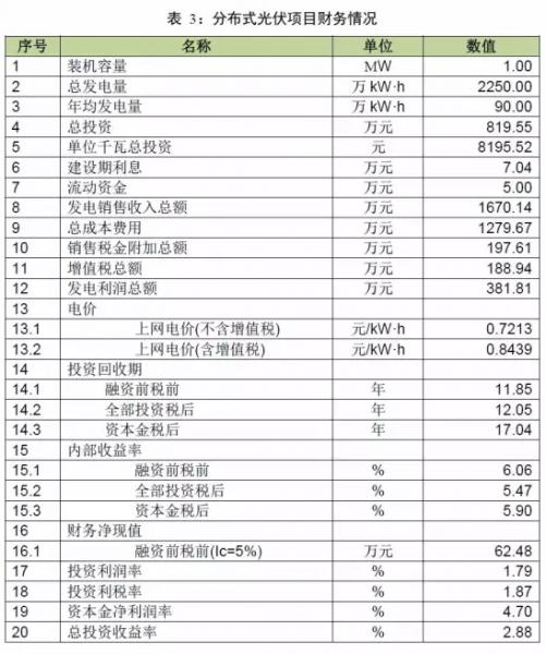 分布式光伏可選擇3種模式:如果選擇“全額上網(wǎng)”方式,對應(yīng)的光伏標桿電價為1元/kWh;如果選擇“自發(fā)自用,余電上網(wǎng)”,所發(fā)電量國家給予0.42元/kWh的電價補貼,上網(wǎng)電量按照當?shù)厝济簶藯U電價收購;選擇全部“自發(fā)自用”,電價為銷售電價和國家補貼之和。根據(jù)廣東省電網(wǎng)銷售電價表,選擇由商業(yè)用電用戶投資,所發(fā)電量全部自用的模式,其電價為0.8439+0.42=1.2639元/kWh,假設(shè)項目裝機容量為1MW,單位造價8000元,年滿發(fā)小時數(shù)900小時,在沒有補貼的情況下,項目融資前稅前收益率在6.06%之間,投資回收期在11年之間,項目收益不滿足投資要求,具體見下表。當項目單位千瓦造價降低至7000元時,方可滿足8%的收益率。目前江蘇省部分地區(qū)對分布式光伏項目給予補貼,按照最高補貼額度0.3元/kWh,補貼時限5年進行計算,項目融資前稅前收益率提高到6.76%,但仍低于8%的要求。