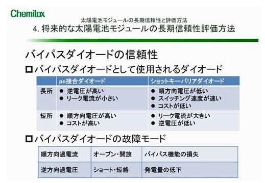 旁路二極管的選擇問題是故障發(fā)生的原因。因成本低而成為主流的肖特基勢壘二極管,與p-n結(jié)二極管相比,其對高溫時(shí)過度的反向電壓和正向電流的耐性較弱(出處:Chemitox)