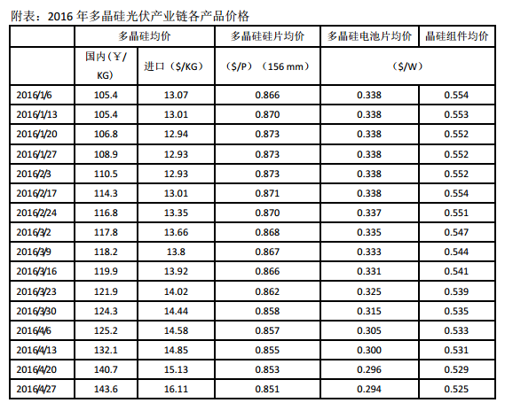 多晶硅價(jià)格漲跌的根本原因只能取決于供需,從2016年初到4月底需求一直維持增長,一季度的增長主要是由于原來未開滿的硅片企業(yè)產(chǎn)能利用率逐漸提升所致,二季度開始的需求持續(xù)旺盛才是新增硅片產(chǎn)能實(shí)質(zhì)釋放的體現(xiàn),隨著二季度產(chǎn)能的逐漸釋放,仍將繼續(xù)推動多晶硅需求增加,使得多晶硅價(jià)格仍有充足的上漲動力。硅片價(jià)格下跌不會成為多晶硅價(jià)格下滑的直接因素,只有到終端需求開始縮減時(shí),硅片電池片企業(yè)開始降低產(chǎn)能利用率,屆時(shí)才會導(dǎo)致多晶硅需求減少,進(jìn)而影響多晶硅價(jià)格。目前在產(chǎn)企業(yè)16家,剛剛恢復(fù)生產(chǎn)的昆明冶研預(yù)計(jì)5月份釋放量在300噸左右,而5月份國內(nèi)檢修企業(yè)影響供應(yīng)量在500噸以上,再加之海關(guān)進(jìn)口嚴(yán)查,供應(yīng)緊張的局勢則更加明顯,因此預(yù)計(jì)多晶硅價(jià)格在6月份之前仍有上漲動力。