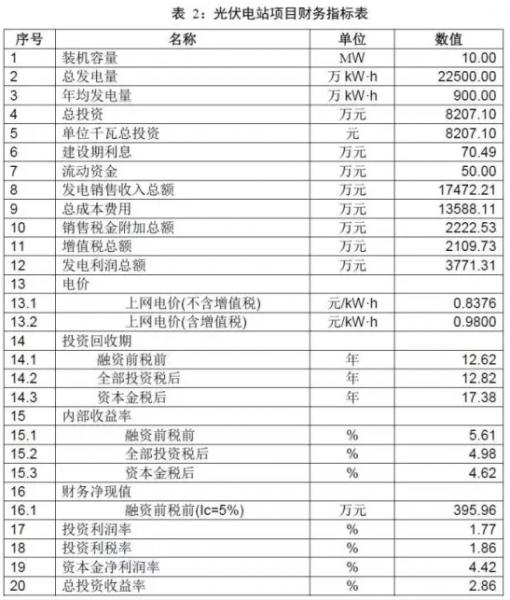 假設(shè)項(xiàng)目單位造價(jià)為8000元,裝機(jī)容量10MW,依據(jù)以上條件測算,在沒有政府補(bǔ)貼的情況下,該項(xiàng)目融資前稅前收益率在5.61%之間,投資不滿足要求,具體見下表。如單位造價(jià)降低至6800元,項(xiàng)目融資前稅前收益率達(dá)到8%,具備投資條件。因此在河南省投資光伏電站應(yīng)做好前期資源分析,選擇資源豐富地區(qū)進(jìn)行開發(fā)。
