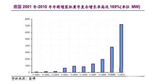 在2001年-2010年10年間,德國光伏裝機年復合增長率高達169%。從2010年到2012年的3年間,瘋狂裝機達到高潮,平均每年的裝機容量增幅達到7GW(2012年高達7.6GW),2013年末,德國光伏裝機總量已經(jīng)達到35.7GW。