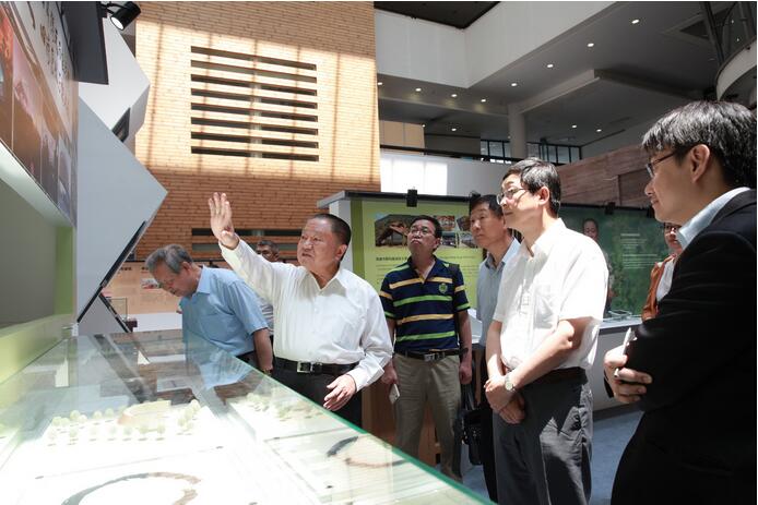 臺達環(huán)境與教育基金會董事長鄭崇華先生 (左二)為參加啟動會的嘉賓與媒體們介紹正在北京清華大學美術學院A座中庭舉行的“綠筑跡│臺達綠色建筑展