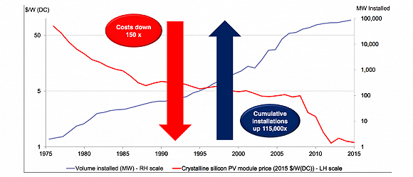 彭博新能源財(cái)還統(tǒng)計(jì)了多年來光伏發(fā)電的價(jià)格發(fā)展趨勢:15年來全球太陽能發(fā)電量已經(jīng)翻番了7次,2015年的太陽能發(fā)電成本已降至1970年代的1/150,而太陽能發(fā)電裝機(jī)總?cè)萘恳呀?jīng)達(dá)到1970年代的11.5萬倍,顯示了太陽能發(fā)展的規(guī)模效益。