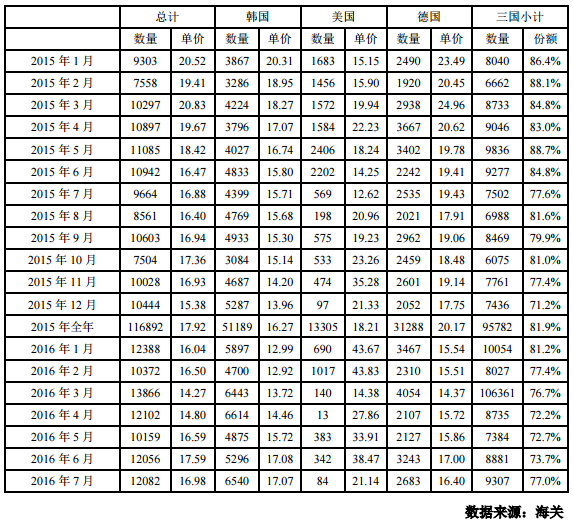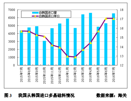 2016年7月份從韓國(guó)進(jìn)口多晶硅量為6540噸,環(huán)比增加23.5%;進(jìn)口單價(jià)微幅下滑至17.07美元/千克,環(huán)比降幅為0.06%。