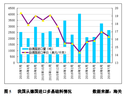 2016年7月份從德國(guó)進(jìn)口多晶硅量為2683噸,環(huán)比減少17.3%;7月份進(jìn)口單價(jià)小幅下滑至16.40美元/千克,環(huán)比降幅為3.5%。