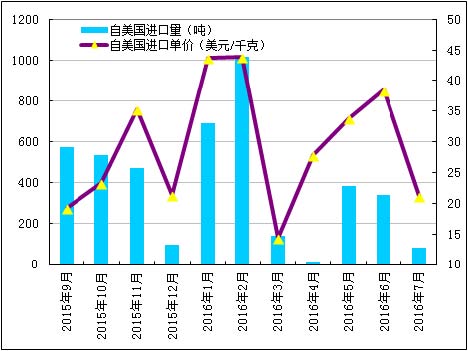 2016年1-9月份累計(jì)從美國(guó)進(jìn)口多晶硅量為3200噸,同比大幅下降73.8%;累計(jì)進(jìn)口均價(jià)38.01美元/千克,同比上漲19.6%。