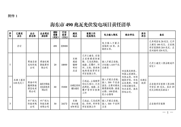 為加快推進(jìn)我市光伏發(fā)電項(xiàng)目,落實(shí)各項(xiàng)建設(shè)條件,爭取盡早開工建設(shè),現(xiàn)將市發(fā)展改革委編制的《海東市490兆瓦光伏發(fā)電項(xiàng)目責(zé)任清單》和《海東市60兆瓦光伏扶貧發(fā)電項(xiàng)目責(zé)任清單》轉(zhuǎn)發(fā)給你們,請結(jié)合實(shí)際加快推進(jìn)落實(shí)。