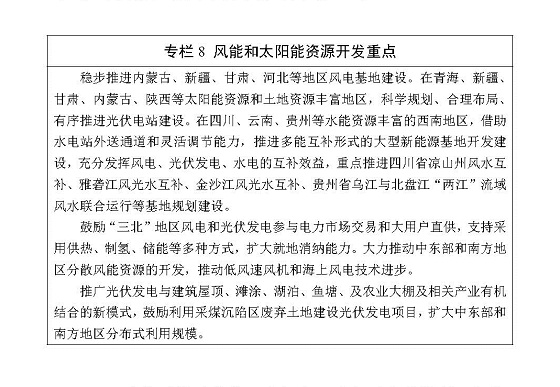推進(jìn)非化石能源可持續(xù)發(fā)展。統(tǒng)籌資源、環(huán)境和市場條件,超前布局、積極穩(wěn)妥推進(jìn)建設(shè)周期長、配套要求高的水電和核電項(xiàng)目,實(shí)現(xiàn)接續(xù)滾動發(fā)展。堅(jiān)持集中開發(fā)與分散利用并舉,調(diào)整優(yōu)化開發(fā)布局,全面協(xié)調(diào)推進(jìn)風(fēng)電開發(fā),推動太陽能多元化利用,因地制宜發(fā)展生物質(zhì)能、地?zé)崮、海洋能等新能源,提高可再生能源發(fā)展質(zhì)量和在全社會總發(fā)電量中的比重。