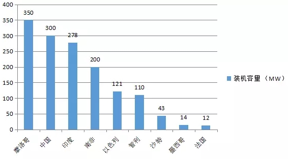 根據(jù)國際能源署太陽能熱發(fā)電和熱化學(xué)組織(SolarPACES)統(tǒng)計,截至2016年2月底,全球在建太陽能光熱發(fā)電站裝機(jī)容量約1.4GW。其中摩洛哥在建裝機(jī)容量最高,達(dá)350MW,包括裝機(jī)200MW的NOORII槽式光熱電站和裝機(jī)150MW的NOORIII塔式光熱電站。中國近幾年也開始發(fā)展光熱發(fā)電產(chǎn)業(yè),在建裝機(jī)容量位居第二位,為300MW(與國內(nèi)統(tǒng)計數(shù)據(jù)略有出入)。印度在建項目的裝機(jī)容量達(dá)278MW,位居第三位,其后是南非、以色列、智利等國。
