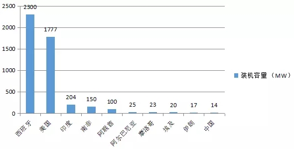國際可再生能源署(IRENA)統(tǒng)計數(shù)據(jù)顯示,截至2015年12月底,西班牙在運光熱電站總裝機(jī)容量為2300MW,占全球總裝機(jī)容量近一半,位居世界第一;美國總裝機(jī)量為1777MW,位列世界第二;兩者合計光熱裝機(jī)超過4GW,約占全球光熱裝機(jī)的88%。其后是印度、南非、阿聯(lián)酋、阿爾及利亞、摩洛哥等國。