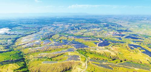 一、走進(jìn)大同采煤沉陷區(qū)國(guó)家先進(jìn)技術(shù)光伏示范基地 春風(fēng)已經(jīng)和煦,站在大同市南郊區(qū)、左云縣接壤的山梁上,只見一塊塊太陽(yáng)能電池板在陽(yáng)光的照射下熠熠生輝、如濤似浪,一座座模塊化預(yù)制艙式變電站矗立其中,將清潔能源源源不斷輸向遠(yuǎn)方。我們看到的是國(guó)家能源局啟動(dòng)的首個(gè)光伏發(fā)電領(lǐng)跑示范基地——大同采煤沉陷區(qū)國(guó)家先進(jìn)技術(shù)光伏示