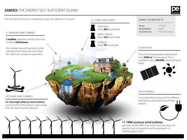 Samsø薩姆索是一座人口不足4000的丹麥小島,但當(dāng)?shù)厝藚s依靠自己的努力消除碳足跡,在不依賴大企業(yè)的特別幫助的情況下達(dá)成了能源上的自給自足,并最終將碳排放降低到幾乎為零。這座小島使用的清潔能源就是風(fēng)能、太陽(yáng)能和生物質(zhì)能,它擁有2500平米的太陽(yáng)能電池板和陸上海上共20余座風(fēng)力發(fā)電機(jī)組。