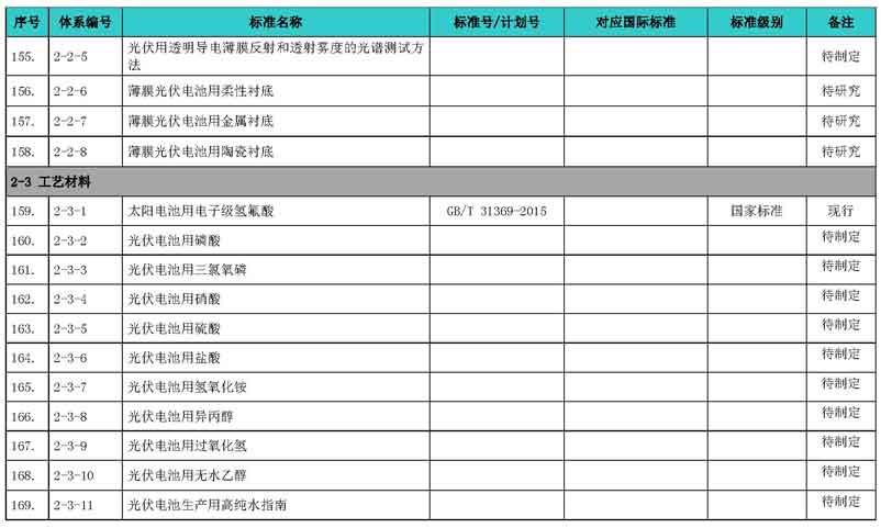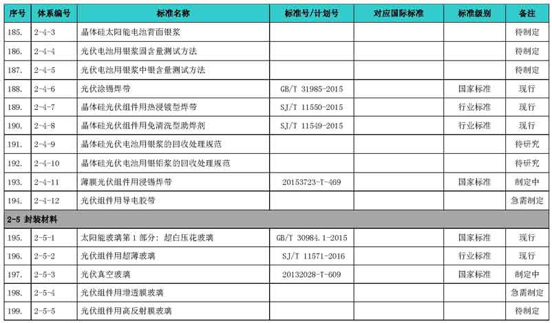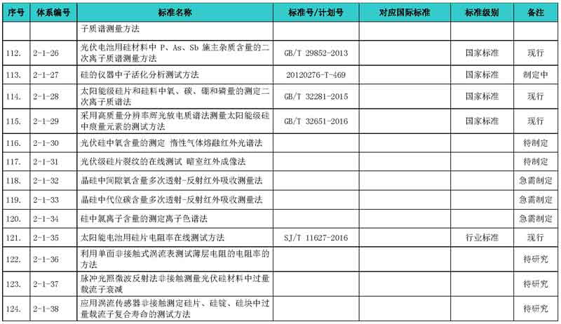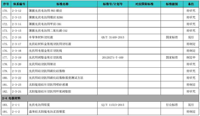 光伏產(chǎn)業(yè)綜合標(biāo)準(zhǔn)化技術(shù)體系表涵蓋國家標(biāo)準(zhǔn)和行業(yè)標(biāo)準(zhǔn),包括現(xiàn)有標(biāo)準(zhǔn)、制修訂中的標(biāo)準(zhǔn)、擬制修訂的標(biāo)準(zhǔn)和待研究的標(biāo)準(zhǔn),共500項(xiàng)。