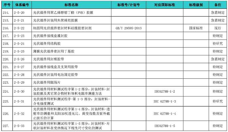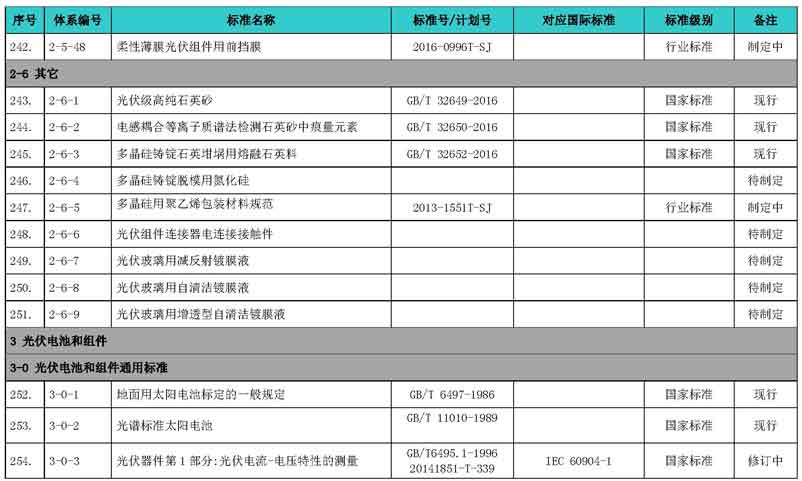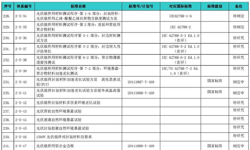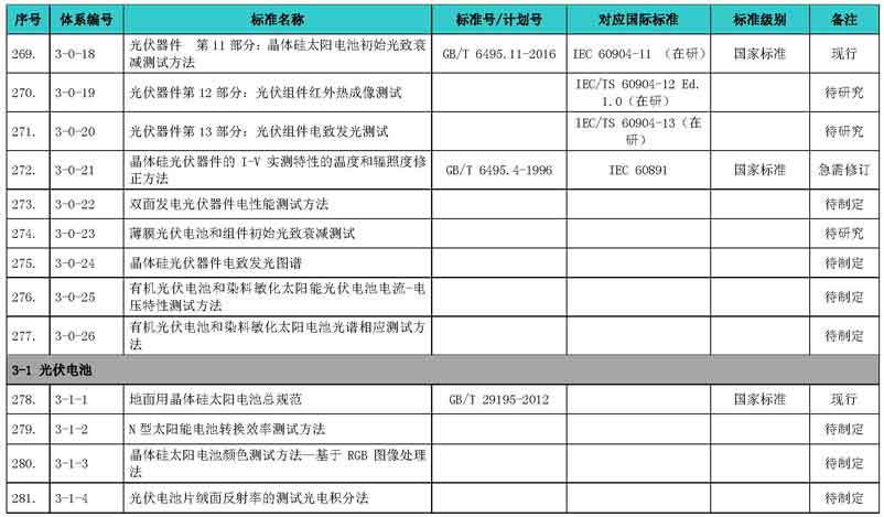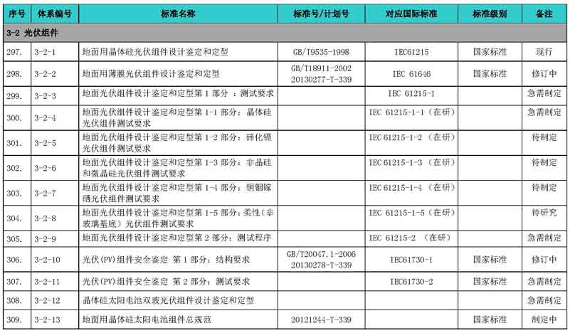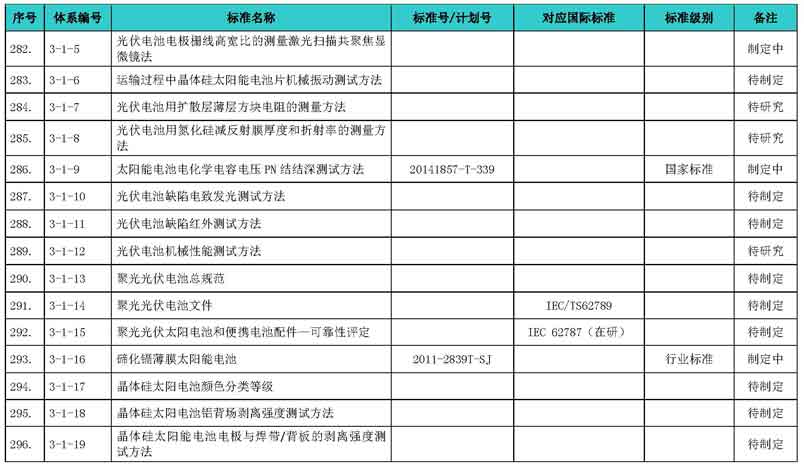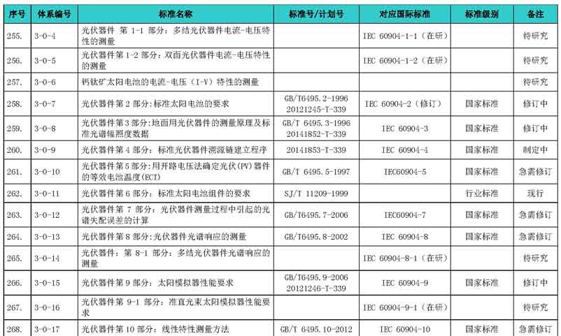 光伏產(chǎn)業(yè)綜合標(biāo)準(zhǔn)化技術(shù)體系表涵蓋國家標(biāo)準(zhǔn)和行業(yè)標(biāo)準(zhǔn),包括現(xiàn)有標(biāo)準(zhǔn)、制修訂中的標(biāo)準(zhǔn)、擬制修訂的標(biāo)準(zhǔn)和待研究的標(biāo)準(zhǔn),共500項(xiàng)。