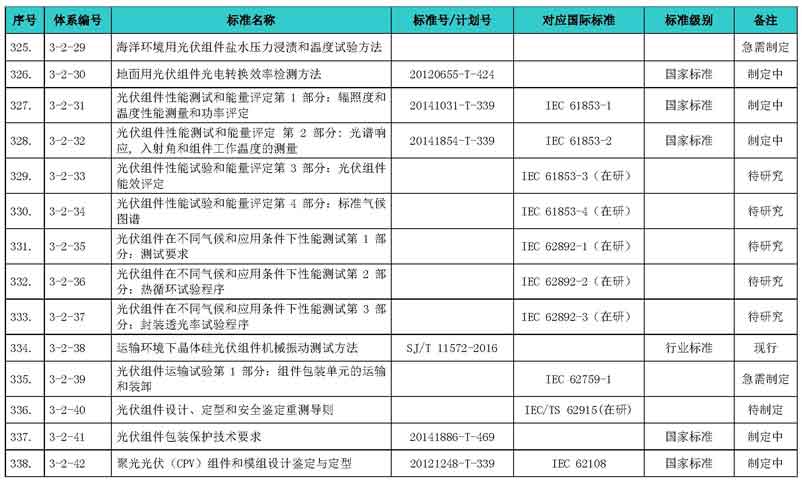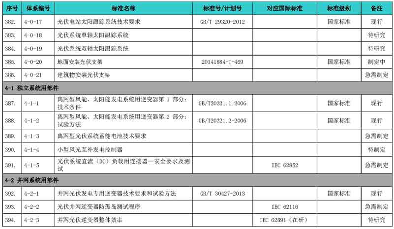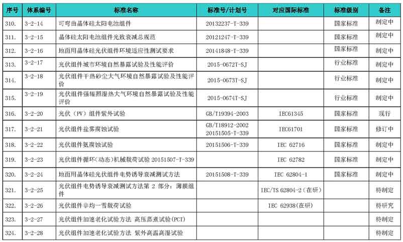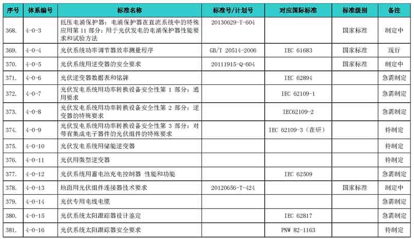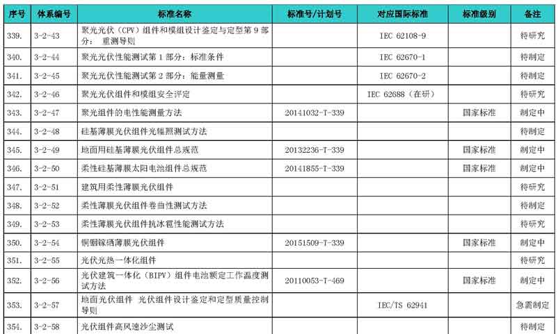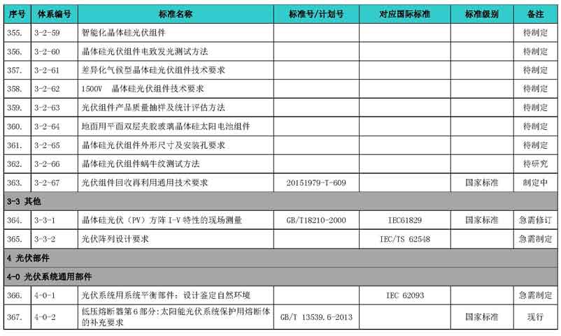 光伏產(chǎn)業(yè)綜合標(biāo)準(zhǔn)化技術(shù)體系表涵蓋國家標(biāo)準(zhǔn)和行業(yè)標(biāo)準(zhǔn),包括現(xiàn)有標(biāo)準(zhǔn)、制修訂中的標(biāo)準(zhǔn)、擬制修訂的標(biāo)準(zhǔn)和待研究的標(biāo)準(zhǔn),共500項(xiàng)。