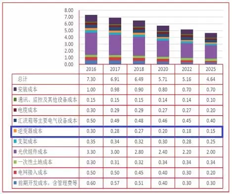 根據(jù)《中國光伏產(chǎn)業(yè)發(fā)展路線圖2016年版》的披露,2016年光伏大型地面電站的總投資成本約為7.3元/W,逆變器成本為0.30元/W,占比只有4%出頭。