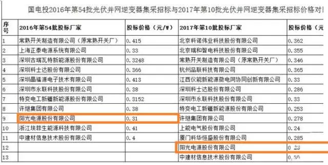 根據(jù)國家電力投資集團公司2017年度第十批集中招標情況,我們看到陽光電源50kw的組串式的投標價格已經(jīng)是0.23元/W,而在2016年國投第54批的逆變器投標中,陽光電源當時給出的投標價格是0.31元/W。