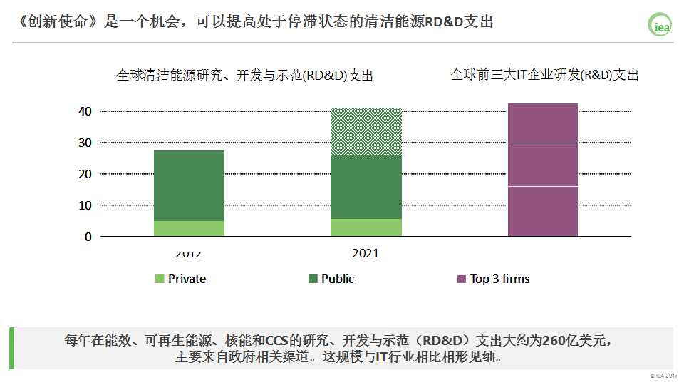 2015年,清潔能源領(lǐng)域研究、開發(fā)和示范RD&D的投資是260億美元。公共部門支出占78%,這其中包括了國(guó)企的支出。