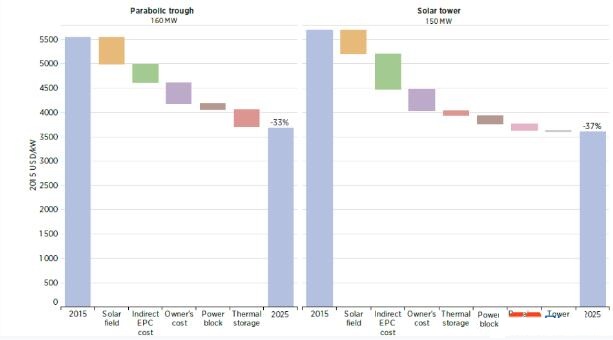 表3:2015-2025年槽式光熱電站與塔式光熱電站成本下降潛力(來(lái)源:IRENA/DLR,2016)