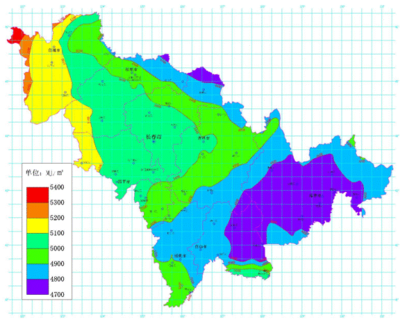吉林省太陽(yáng)能資源豐富,全省多年平均日照時(shí)數(shù)為2200~3000小時(shí),年太陽(yáng)總輻射量為5051.7兆焦耳/平方米,根據(jù)太陽(yáng)能資源評(píng)估方法(QX/T89-2008),屬資源很豐富級(jí)別,全省太陽(yáng)能資源總體屬于二類。