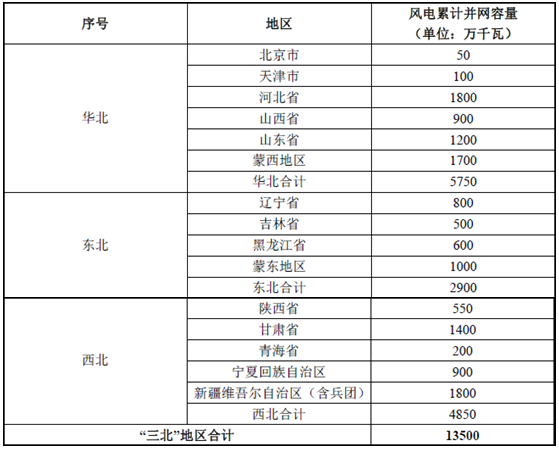 到2020 年,“三北”地區(qū)在基本解決棄風問題的基礎上,通過促進就地消納和利用現有通道外送,新增風電并網裝機容量3500 萬千瓦左右,累計并網容量達到1.35 億千瓦左右。相關省(區(qū)、市)在風電利用小時數未達到最低保障性收購小時數之前,并網規(guī)模不宜突破規(guī)劃確定的發(fā)展目標。
