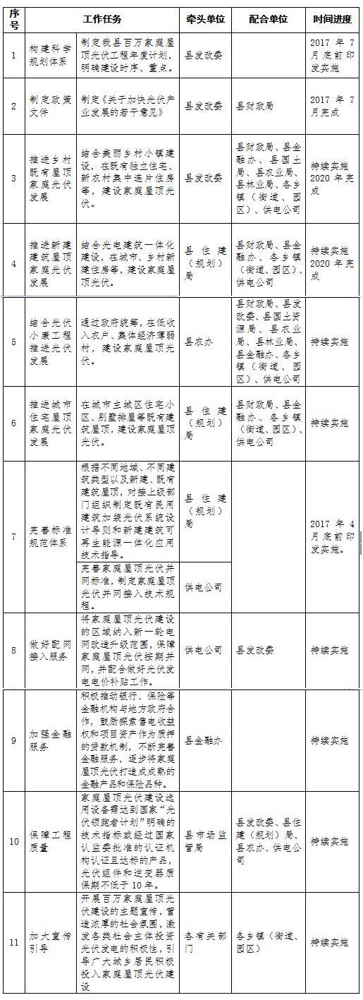 縣發(fā)改委:承擔(dān)縣光伏應(yīng)用產(chǎn)業(yè)領(lǐng)導(dǎo)小組辦公室職責(zé),并負(fù)責(zé)年度計(jì)劃、項(xiàng)目審批、項(xiàng)目單位報(bào)備、監(jiān)管、督查考核、政策兌現(xiàn)以及對(duì)上爭(zhēng)取等工作。