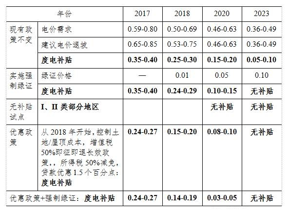 2020年新建項(xiàng)目度電補(bǔ)貼強(qiáng)度可以2017年基礎(chǔ)上降低0.2元/千瓦時(shí)左右,達(dá)到0.15-0.20元/千瓦時(shí),2023年度電補(bǔ)貼強(qiáng)度可以2020年基礎(chǔ)上再降低0.1元/千瓦時(shí)左右,補(bǔ)度電貼強(qiáng)度普遍在0.1元/千瓦時(shí)以內(nèi)。