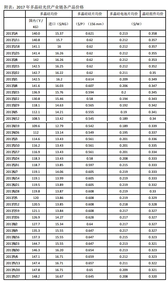 從年初到9月底,國(guó)內(nèi)多晶硅均價(jià)12.99萬(wàn)元/噸,相比去年同期小幅上漲1.5%。未來(lái)預(yù)期:需求方面,進(jìn)入第四季度后,第二批領(lǐng)跑者基地、光伏扶貧等項(xiàng)目、各省指標(biāo)的陸續(xù)發(fā)放以及分布式補(bǔ)貼即將調(diào)整等政策繼續(xù)刺激終端需求, 以及由于金剛線切割硅片和黑硅電池片新技術(shù)帶來(lái)的成本下降后對(duì)下游消費(fèi)形成的側(cè)面刺激,具體表現(xiàn)為下游鑄拉晶企業(yè)采購(gòu)意向較為明朗,部分企業(yè)已開(kāi)始洽談11月份訂單。供應(yīng)方面,十月份新特、大全、南玻、神舟、國(guó)電均有檢修計(jì)劃,國(guó)內(nèi)供應(yīng)將有所減少。因此在終端需求穩(wěn)定,供應(yīng)減少的情況下,預(yù)計(jì)未來(lái)一個(gè)月之內(nèi),多晶硅價(jià)格仍可獲支撐。四季度若沒(méi)有新光伏補(bǔ)貼政策到位,多晶硅價(jià)格或因終端需求的降溫而有所回落,低點(diǎn)大約在12-13萬(wàn)元/噸。