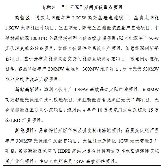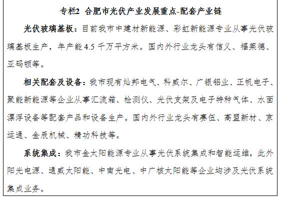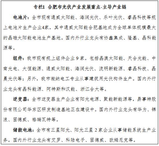 通過采取鞏固一批、拓展一批、培育一批、引進(jìn)一批等措施,持續(xù)推進(jìn)光伏重點(diǎn)項(xiàng)目建設(shè),繼續(xù)壯大產(chǎn)業(yè)規(guī)模。鞏固一批,支持晶澳太陽能、通威太陽能、陽光電源等龍頭企業(yè)繼續(xù)加大技術(shù)改造和產(chǎn)品研發(fā)力度,繼續(xù)保持國(guó)內(nèi)乃至全球領(lǐng)先地位。拓展一批,爭(zhēng)取海潤(rùn)光伏、三星SDI、樂葉光伏、彩虹新能源、天合光能、中建材新能源等國(guó)內(nèi)外重點(diǎn)光伏企業(yè)搶抓新能源產(chǎn)業(yè)發(fā)展機(jī)遇,加大在肥投資力度,擴(kuò)大企業(yè)規(guī)模。培育一批,積極支持中南光電、睿晶科技、大恒能源、晶晨光伏、流明新能源、聚能新能源、微納電工等本地一批中小企業(yè)發(fā)展壯大。引進(jìn)一批,主動(dòng)吸引國(guó)內(nèi)外電池片、組件、逆變器重點(diǎn)企業(yè),特別是光伏輔材、建筑用光伏構(gòu)件、薄膜發(fā)電、光熱發(fā)電產(chǎn)品重點(diǎn)生產(chǎn)企業(yè)和光伏生產(chǎn)設(shè)備制造企業(yè)集聚我市,建設(shè)世界級(jí)光伏產(chǎn)業(yè)集群。