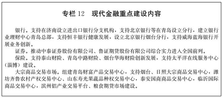 推動金融業(yè)務(wù)創(chuàng)新。加快完善金融市場、金融組織、金融產(chǎn)品和服務(wù)模式,更好滿足實體經(jīng)濟和人民群眾多樣化的金融需求。鼓勵利用互聯(lián)網(wǎng)、大數(shù)據(jù)、人工智能等,進行金融業(yè)務(wù)流程改造和產(chǎn)品創(chuàng)新。積極發(fā)展養(yǎng)老金融、教育金融、文化金融、旅游金融、農(nóng)村金融等新型金融服務(wù)。規(guī)范發(fā)展互聯(lián)網(wǎng)金融、區(qū)塊鏈、人工智能等領(lǐng)域的新型金融業(yè)態(tài)。支持小額貸款公司、典當(dāng)、融資租賃、商業(yè)保理等金融組織創(chuàng)新、可持續(xù)發(fā)展。統(tǒng)籌發(fā)展介于現(xiàn)貨與期貨之間的大宗商品交易業(yè)務(wù),打造具有全國影響力的交易場所。支持濟南推進新舊動能轉(zhuǎn)換金融創(chuàng)新發(fā)展試點,開展金融服務(wù)實體經(jīng)濟改革創(chuàng)新。支持煙臺開展基金管理服務(wù)專項改革創(chuàng)新,青島建設(shè)財富管理金融綜合改革試驗區(qū)。支持棗莊、臨沂等市開展普惠金融改革創(chuàng)新,探索完善區(qū)域普惠金融服務(wù)體系。支持濰坊建設(shè)文化藝術(shù)金融綜合試驗區(qū)、德州舉辦京津冀魯資本技術(shù)交易大會。
