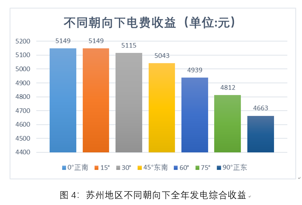 我們將峰谷不同時(shí)段的發(fā)電量與峰谷電價(jià)相乘,得出不同朝向下的發(fā)電綜合收益(如下圖)。雖然朝向向東可以增加峰時(shí)段的發(fā)電量,但是由于全年發(fā)電量的下降,綜合收益還是正南~南偏東15°朝向最高。