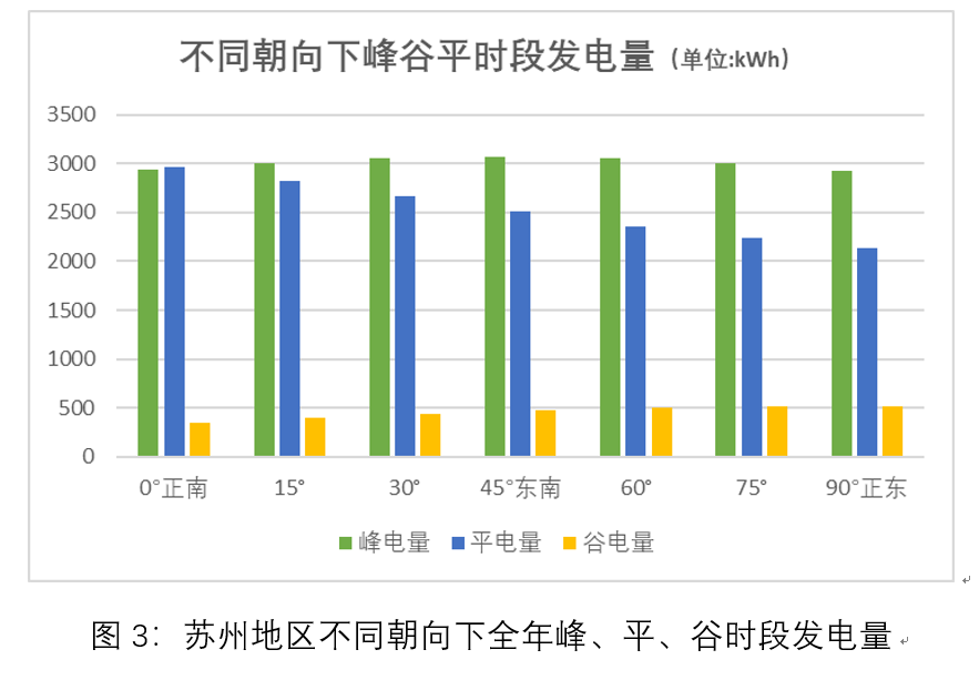 將分時(shí)發(fā)電量按峰谷時(shí)段進(jìn)行統(tǒng)計(jì),在東南向45°時(shí),全年峰時(shí)段發(fā)電量達(dá)到最高。