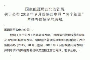 11月28日,國(guó)家能源局西北監(jiān)管局印發(fā)《關(guān)于公布2018年9月份陜西電網(wǎng)“兩個(gè)細(xì)則”考核補(bǔ)償情況的通知》;根據(jù)《關(guān)于印發(fā)<西北區(qū)域發(fā)電廠并網(wǎng)運(yùn)行管理實(shí)施細(xì)則>及<西北區(qū)域并網(wǎng)發(fā)電廠輔助服務(wù)管理實(shí)施細(xì)則>的通知》(西北監(jiān)能市場(chǎng)〔2015〕28號(hào))規(guī)定,2018年9月份陜西電網(wǎng)發(fā)電廠并網(wǎng)