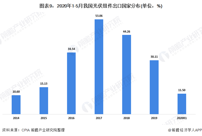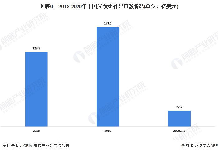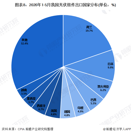 2020年1-5月,我國光伏組件出口市場中,歐洲占比進一步增大為40%,成為最大出口區(qū)域。而美國時隔兩年再次進去前十市場,2020年1-5月,我國對美國出口額為3.1億美元,同比增長20倍以上。