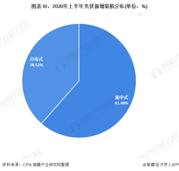 2020年上半年,在新增光伏裝機中,集中式光伏裝機新增7.07GW,占比為61.48%;分布式光伏裝機新增4.43GW,占比為38.52%。(以上數(shù)據(jù)來源于前瞻產業(yè)研究院《中國光伏發(fā)電產業(yè)市場前瞻與投資戰(zhàn)略規(guī)劃分析報告》)