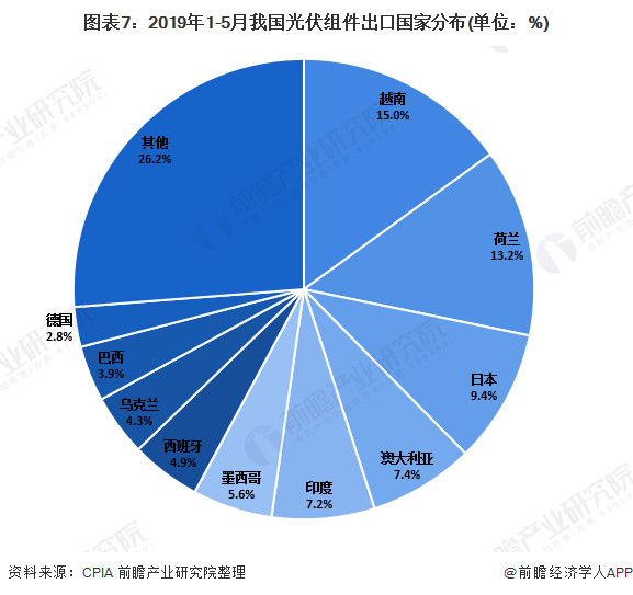 2019年我國光伏組件出口市場多元化發(fā)展,市場趨于分散。前十出口市場中亞洲國家有3個,歐洲國家有4個,拉美國家有2個。2020年1-5月,光伏組件出口額為27.7GW,同比下降1.8%。2020年上半年出口額在33-35GW左右。