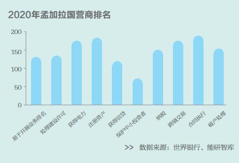 從營(yíng)商環(huán)境看,根據(jù)《2020年?duì)I商環(huán)境報(bào)告》,孟加拉國(guó)營(yíng)商環(huán)境位列全球第168名。孟加拉國(guó)在保護(hù)中小投資者方面具備優(yōu)勢(shì),排名相對(duì)靠前,但在易于開(kāi)展業(yè)務(wù)排名、處理建設(shè)許可、獲得電力、獲得信貸方面、注冊(cè)資產(chǎn)、獲得信貸、納稅、跨境交易和合同執(zhí)行等方面排名靠后。