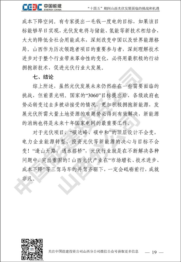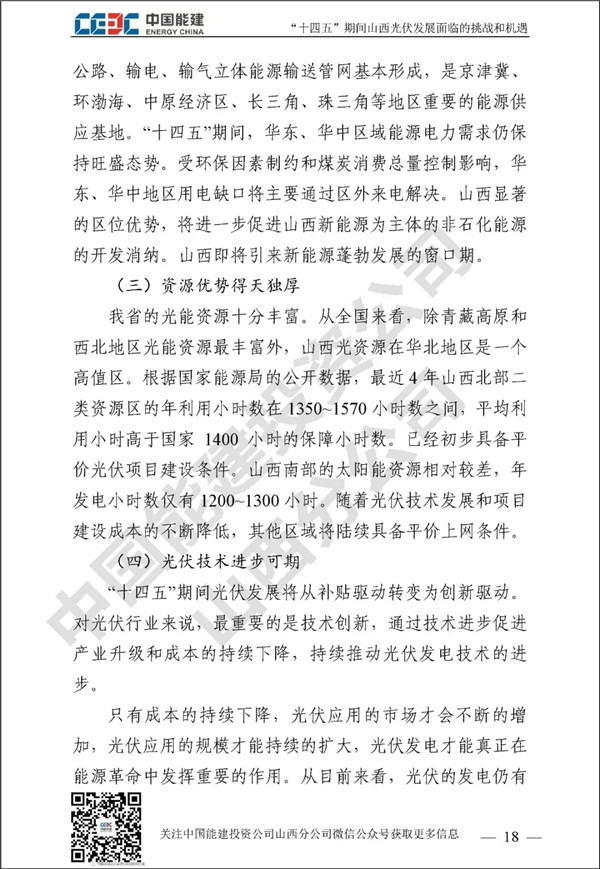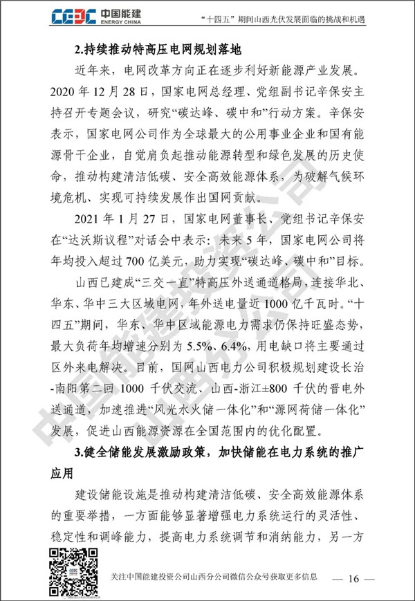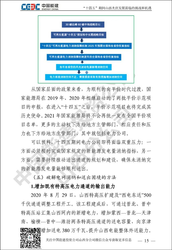 山西作為我國絕對的電力大省,“十三五”期間新能源發(fā)展成績矚目。“碳達(dá)峰”和“碳中和”目標(biāo)對山西新能源行業(yè)發(fā)展既是挑戰(zhàn)更是機(jī)遇。中國能建投資公司山西分公司通過對諸多和光伏未來發(fā)展相關(guān)的政府規(guī)劃、行業(yè)政策、關(guān)鍵數(shù)據(jù)進(jìn)行歸納整理,并進(jìn)行分析研究,針對“土地和消納土地資源緊缺和電網(wǎng)消納困難”已經(jīng)成為光伏發(fā)展最大攔路虎這一行業(yè)