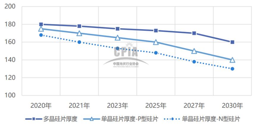 薄片化有利于降低硅耗和硅片成本,但會(huì)影響碎片率。目前切片工藝完全能滿足薄片化的需要,但硅片厚度還要滿足下游電池片、組件制造端的需求。硅片厚度對(duì)電池片的自動(dòng)化、良率、 轉(zhuǎn)換效率等均有影響。2020 年,多晶硅片平均厚度為180μm,P型單晶硅片平均厚度在175μm 左右,N型硅片平均厚度為168μm(見(jiàn)圖6)。