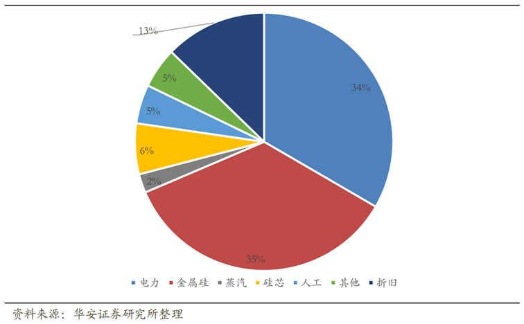 大家都清楚,若某一行業(yè)存在較深的壁壘,那么便存在著進入者障礙,在需求釋放的前提下,行業(yè)發(fā)展前景就更加明確,而多晶硅的產(chǎn)能壁壘,除了前文所提到的之外,從成本構(gòu)成上來分析也較為清晰,從下圖中,我們明顯看出硅料大部分的成本來自電力和原材料。