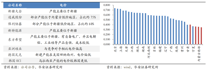 從圖中可以看出,電力的優(yōu)勢是壁壘之一,而下圖則可以明顯看出,硅料龍頭企業(yè)普遍分布在電價較低的區(qū)域,并且通過自備電廠使得成本大幅下降,在限火限電的背景下,其它企業(yè)難以復(fù)制。