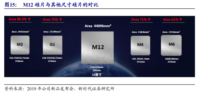 從產(chǎn)品性能上看,M12硅片全方面強(qiáng)于傳統(tǒng)硅片,與當(dāng)時(shí)主流的G1硅片相比,效率提升近75%。根據(jù)中環(huán)的測(cè)算,M12電池片的成本可降低7.9分/瓦,組件成本可降低12.6分/瓦。除產(chǎn)業(yè)鏈配套暫未跟上外,暫無(wú)明顯缺點(diǎn)。