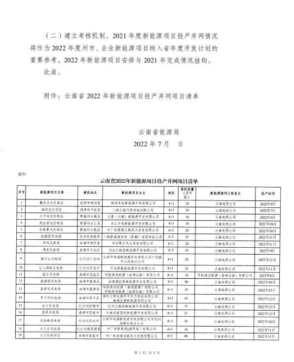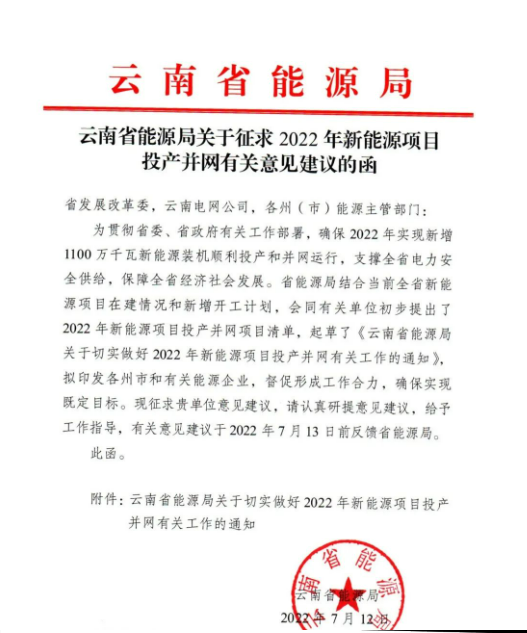7月12日,云南省能源局發(fā)布了《關(guān)于征求2022年新能源建設(shè)方案》和《關(guān)于征求2022年新能源項(xiàng)目投產(chǎn)并網(wǎng)有關(guān)意見(jiàn)建議的函》,目前這個(gè)兩個(gè)文件均為征求意見(jiàn)稿。