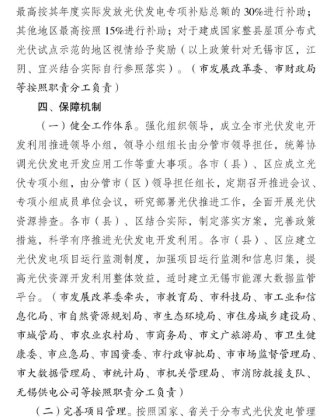 10月11日,江蘇無錫市政府發(fā)布《關(guān)于大力推進全市光伏發(fā)電規(guī);_發(fā)應(yīng)用的實施意見》!秾嵤┮庖姟诽岢,“十四五”期間,對于完成新增并網(wǎng)目標(biāo),安排光伏發(fā)電補貼資金并落實補貼的地區(qū),市級自 2022年起分年度給予補助。對納入全國整縣(市、區(qū))屋頂分布式光伏開發(fā)試點的地區(qū),最高按其年度實際發(fā)放光伏發(fā)電專項補貼總