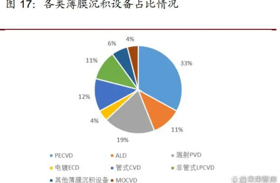 2020 年全球半導(dǎo)體薄膜沉積設(shè)備市場(chǎng)規(guī)模約 172 億美元。根據(jù) Maximize Market Research 數(shù)據(jù)統(tǒng)計(jì),2017-2019 年全球半導(dǎo)體薄膜沉積設(shè)備市場(chǎng)規(guī)模 分別為 125 億美元、145 億美元和 155 億美元,2020 年擴(kuò)大至約 172 億美元, 年復(fù)合增長(zhǎng)率為 11.2%。根據(jù) Maximize Market Research 的預(yù)計(jì),全球半導(dǎo) 體薄膜沉積設(shè)備市場(chǎng)規(guī)模在 2025 年達(dá)到 340 億美元,保持年復(fù)合 13.3%的增長(zhǎng) 速度。從設(shè)備投資占比角度來看,薄膜沉積設(shè)備作為晶圓制造的三大主設(shè)備之一,其投資規(guī)模占晶圓制造設(shè)備總投資的 25%。根據(jù)不同的應(yīng)用場(chǎng)景,薄膜沉積設(shè)備 可分為 PECVD、濺射 PVD、ALD、LPCVD 等不同的設(shè)備。其中,PECVD 是薄 膜設(shè)備中占比最高的設(shè)備類型,占整體薄膜沉積設(shè)備市場(chǎng)的 33%。