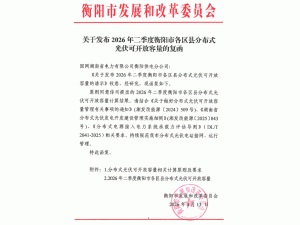 4月13日,湖南省衡陽市發(fā)改委發(fā)布”關(guān)于發(fā)布2026年二季度衡陽市各區(qū)縣分布式光伏可開放容量的復(fù)函“,對全市2026年二季度分布式光伏可開放容量進(jìn)行公示。