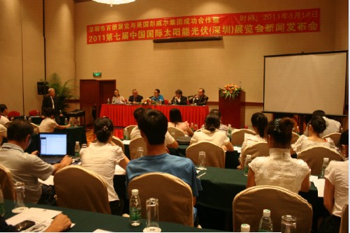 2011年8月16日,世界大學(xué)生運(yùn)動(dòng)會(huì)正在深圳熱烈進(jìn)行之際,來自五湖四海的海內(nèi)外嘉賓在中國深圳富臨大酒店華龍殿歡聚一堂,慶祝美國彭威爾集團(tuán)與深圳百德展覽有限公司成功合作, 共同推廣2011年第七屆中國國際太陽能光伏(深圳)展覽會(huì),暨2011年亞洲太陽能展覽會(huì)中國深圳展新聞發(fā)布會(huì)。美國彭威爾集團(tuán)國際展會(huì)董事長——格蘭•安舍先生、彭威爾集團(tuán)副總裁及世界可再生能源網(wǎng)站總裁吉姆•凱利翰先生、獨(dú)立電力生產(chǎn)商協(xié)會(huì)秘書長萊金先生、深圳百德展覽有限公司董事長李欽祥先生出席了發(fā)布會(huì)并進(jìn)行了講話,國內(nèi)外數(shù)十家太陽能光伏產(chǎn)業(yè)相關(guān)的企業(yè)、協(xié)會(huì)也參與了此次會(huì)議。
