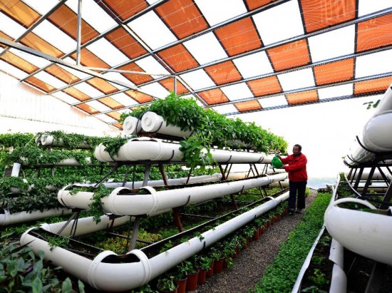 11月27日,山東省即墨市普東鎮(zhèn)農(nóng)民李福德在“太陽能大棚”里管理立體栽培的蔬菜。   2011年起,一種棚頂能利用太陽能發(fā)電,棚內(nèi)可發(fā)展生態(tài)農(nóng)業(yè)的新型“太陽能大棚”在山東省即墨市普東鎮(zhèn)發(fā)展起來。這種“太陽能大棚”由即墨的大型光伏企業(yè)投資興建,既節(jié)約了土地資源,又為當?shù)靥峁┝吮姸嗟木蜆I(yè)機會,提高了農(nóng)產(chǎn)品的效益,實現(xiàn)了企業(yè)和農(nóng)民