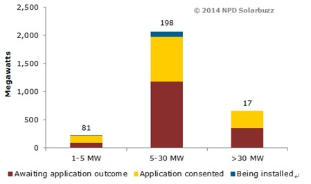 作為英國的主流規(guī)模類別,5MW到30MW的中等規(guī)模的太陽能發(fā)電廠專案儲備已成長至198個項(xiàng)目。超過80個項(xiàng)目有充分的規(guī)劃同意書,NPD Solarbuzz 英國項(xiàng)目追蹤數(shù)據(jù)庫報告顯示這80個項(xiàng)目大部分會在2015年4月前完成。